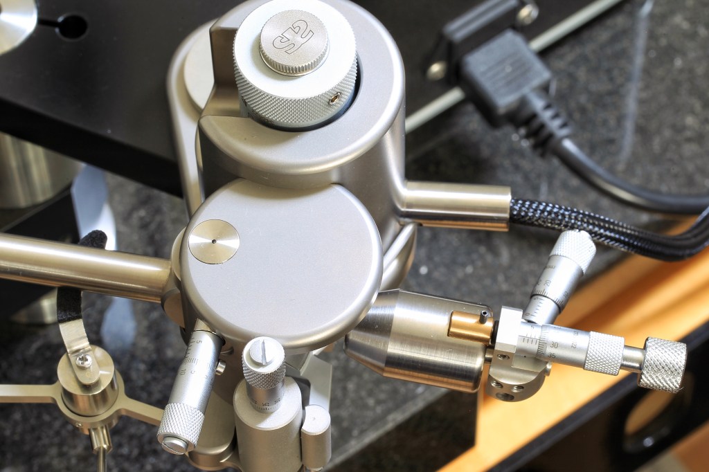All static and dynamic adjustements are made by micrometer drive with scale.Static VTF can be set with 1/500 gram precision with scale!Likewise dynamic – non-touch – VTF with 1/500 gram, VTA-tower height by 1/1000 mm (that‘s 1µm!!) precision, anti-skating by 1/500 mN.Also lateral balance – a rare feature in tonearms ourdays – is set by micrometer with scale.
