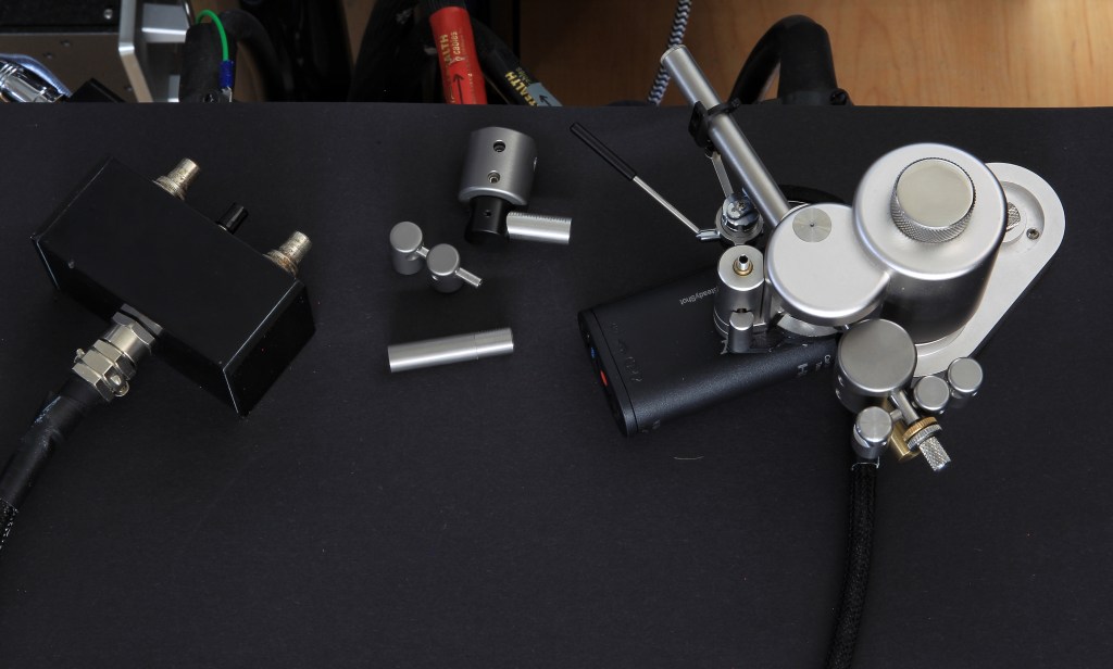 Knowing that the closer the counter weight comes to the pivot point the better is the dynamic behavior and it is lowering the moved effective mass of the tonearm. Therefore I ordered a heavier weight and some extra tools you see on the first image above.