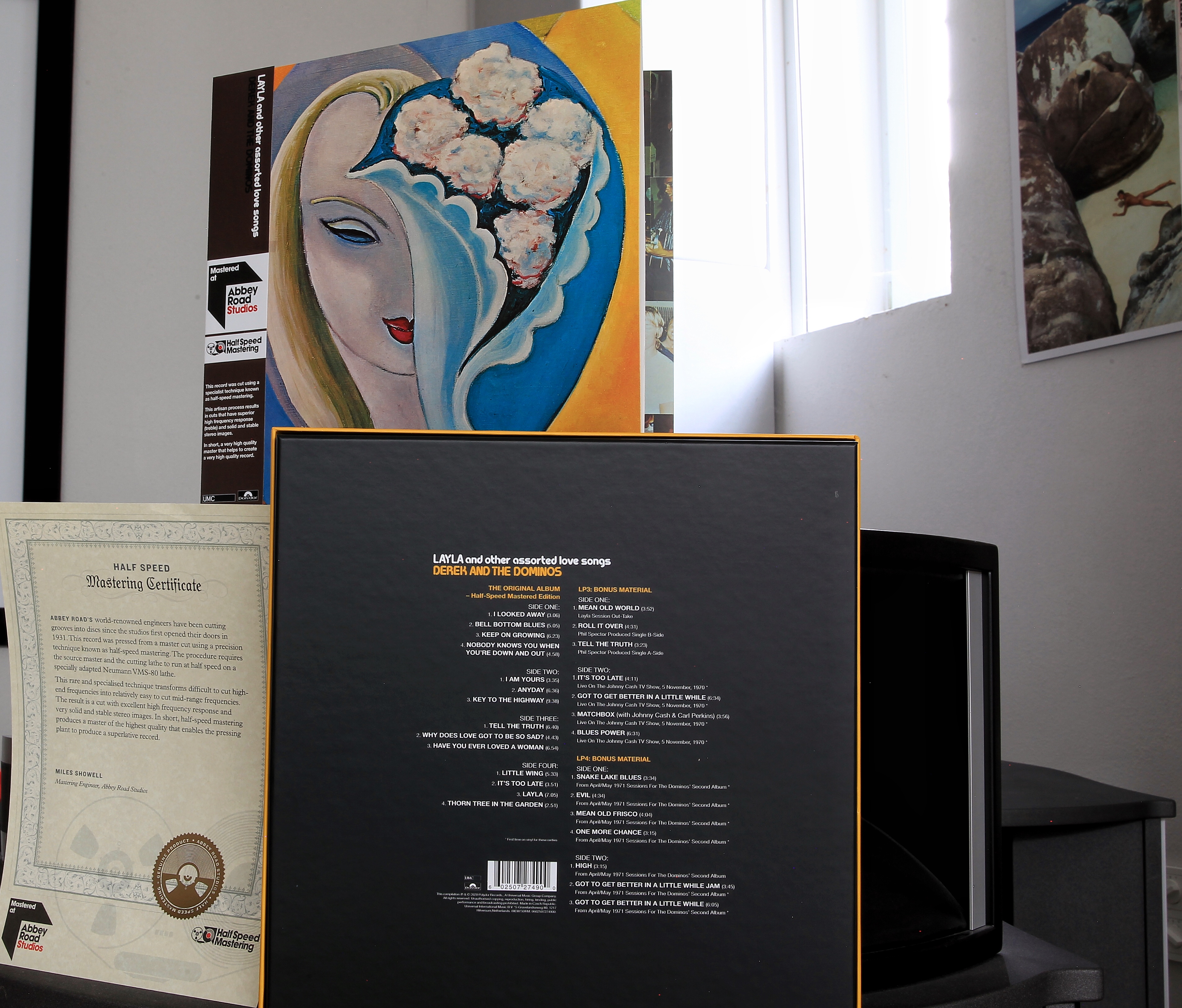 The box comes with additional tracks (not half speed mastered) recorded at Abbey Road Studios in 1970 during the sessions of George Harrison’s „All Things Must Pass“ and some live recordings at the Ryman Auditorium, Nashville. LP 4 was recorded at Olympic Studios in London.