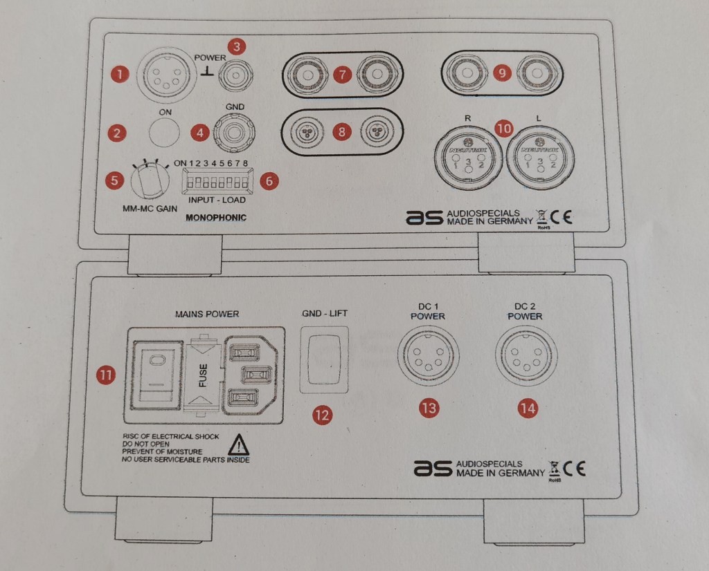 The 4 step GAIN switch on the backside of the Monophonic unit results in +31 / +41 / +47/ +58/ (+68dB via the two red jumpers) amplification. Using the XLR output (AS transformer, small silver box at the left upper side) you may put it to 74 dB amplification when moving the two red jumpers in front of the AS transformer. Just do this by bridging pin 2 & 3 of the total 4 pins with one jumper. You will then boost the output level of 775 mV ( Hifi) onto 1,55 V (studio level at sound places for XLR output).