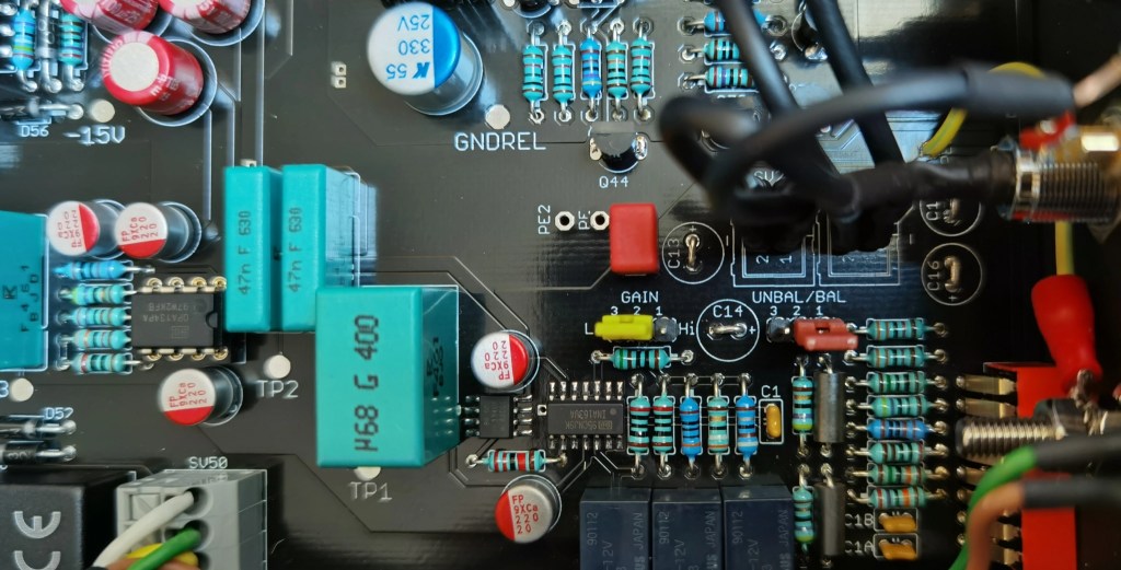 using my balanced cables I put the red jumpers on balanced and the yellow one on high gain (different than shown in this picture, it was put for Pierre Clement, low gain, here).