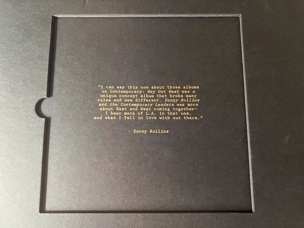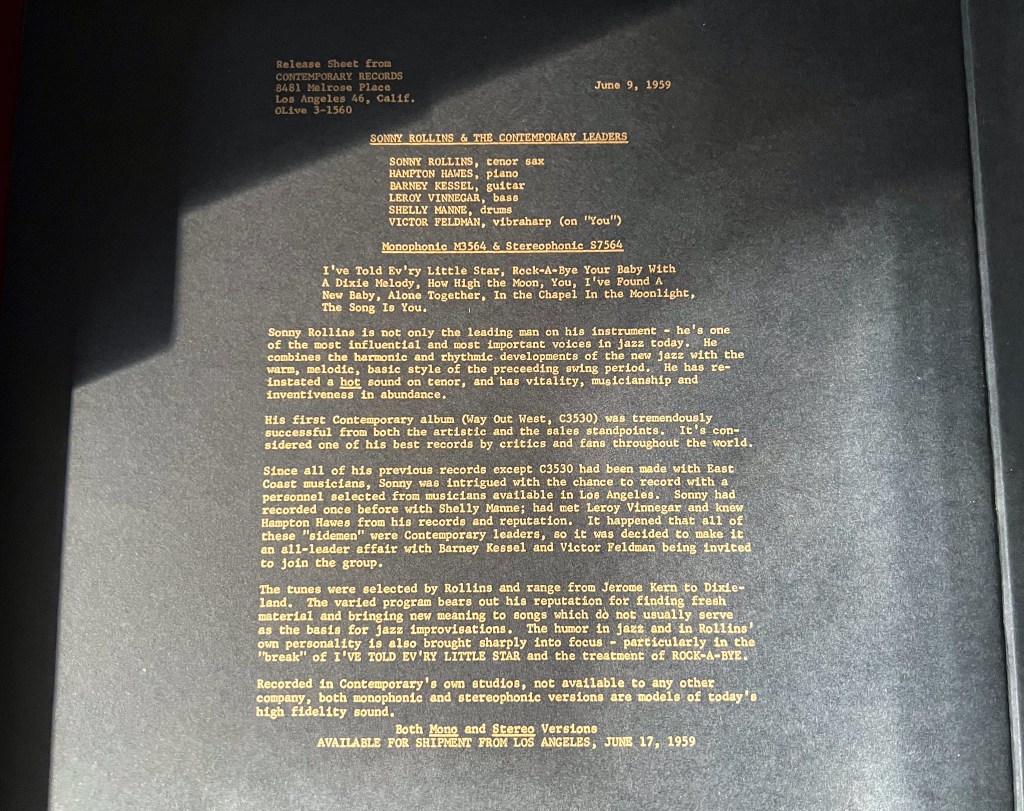 65 years ago… Posted on 18. July 202322. July 2023 by conchan1 Bernie Grundmann ´s remastering work from the original stereo tapes is remarkable. The sound is such clear, with quiet background letting the instruments fully blossom. NEW SONNY ROLLINS COLLECTION GO WEST!: THE CONTEMPORARY RECORDS ALBUMS ARRIVES JUNE 23 Share this: Click to share on X (Opens in new window) X Click to share on Facebook (Opens in new window) Facebook More Click to email a link to a friend (Opens in new window) Email Click to share on Reddit (Opens in new window) Reddit Click to share on LinkedIn (Opens in new window) LinkedIn Like Loading... Related