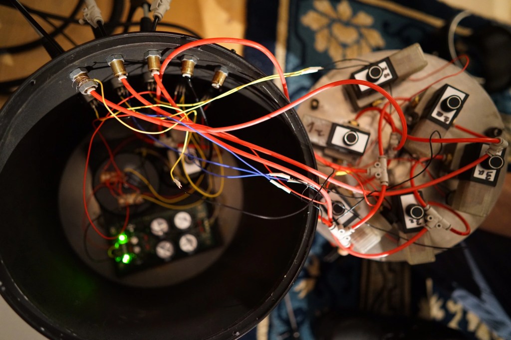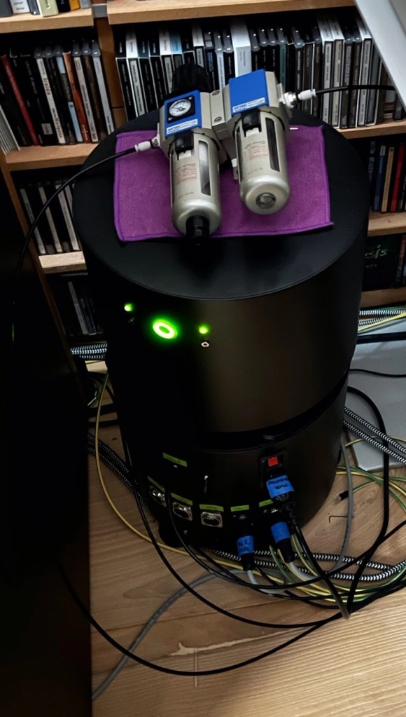 this is my unique airbearing system feeded by a large compressor standing in a different room providing enough air for the real airbearing it uses. It has two exquisite vintage tonearms, SAEC 506 with lifting mechanism and SpJ Titan coming with a Lyra Titan (SAEC) and a Kondo IO-m (SpJ). All feet are lifted by air too. Bearing and feet are controlled by a separate unit.