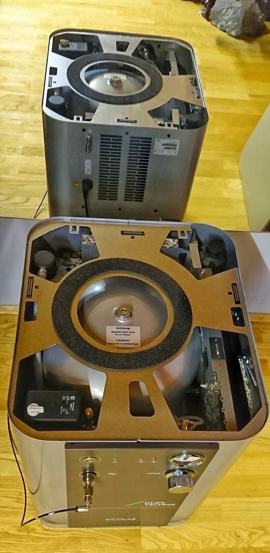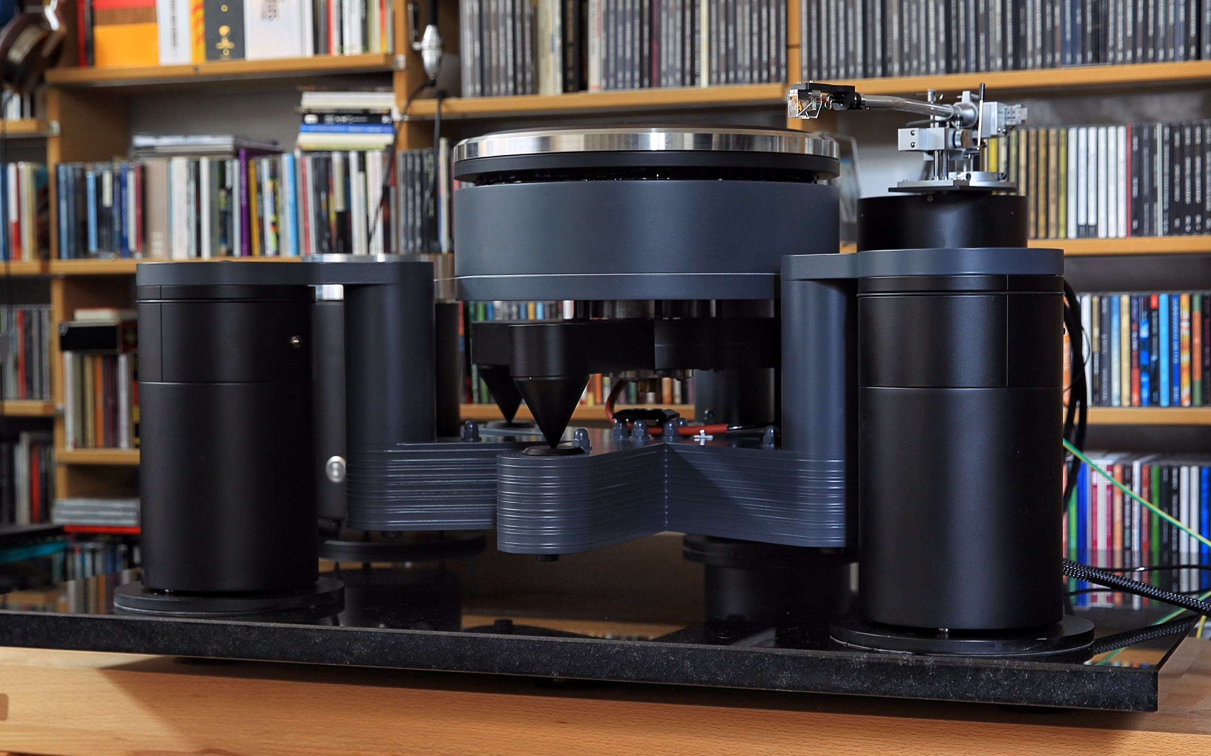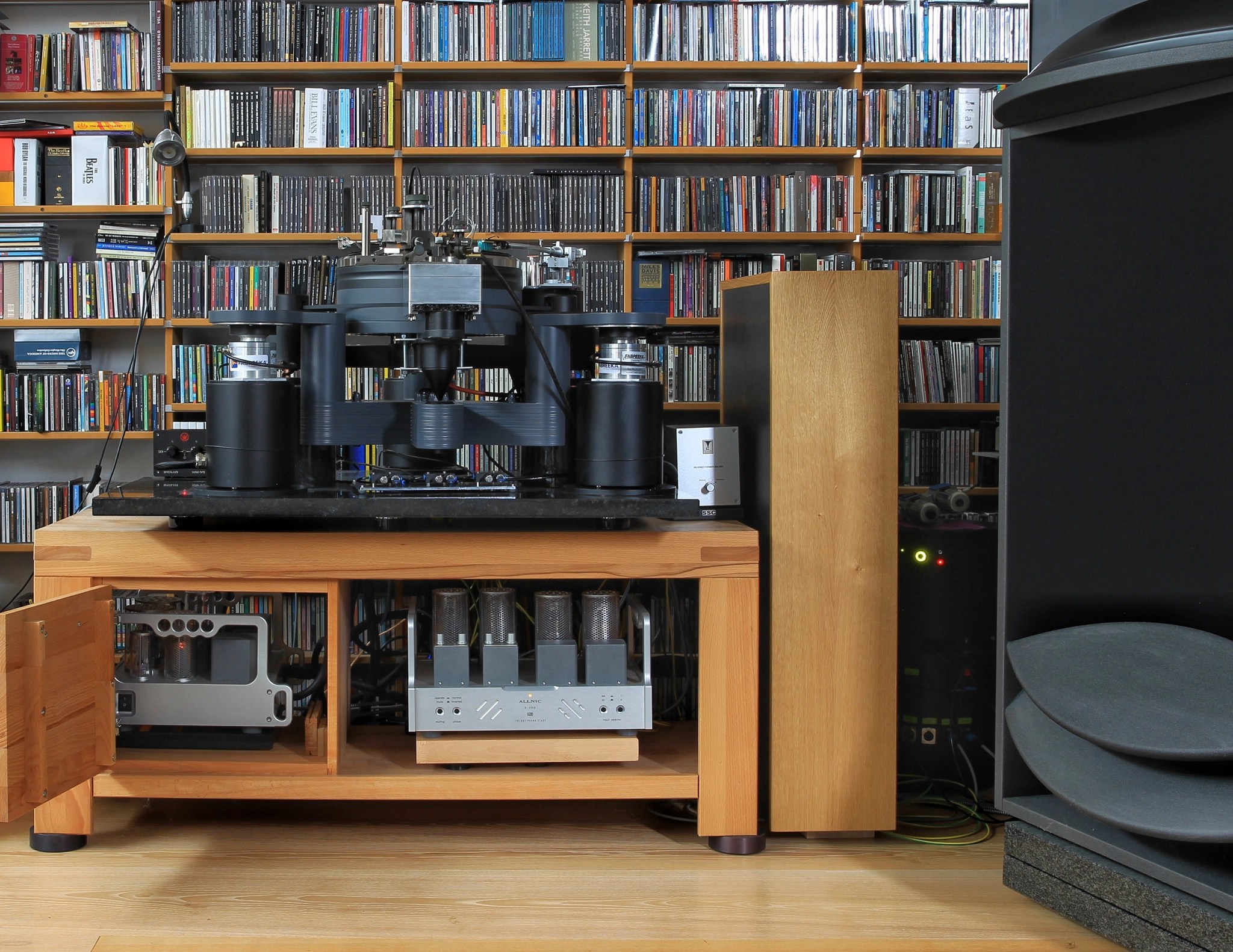 this is my unique airbearing system feeded by a large compressor standing in a different room providing enough air for the real airbearing it uses. It has two exquisite vintage tonearms, SAEC 506 with lifting mechanism and SpJ Titan coming with a Lyra Titan (SAEC) and a Kondo IO-m (SpJ). All feet are lifted by air too. Bearing and feet are controlled by a separate unit.