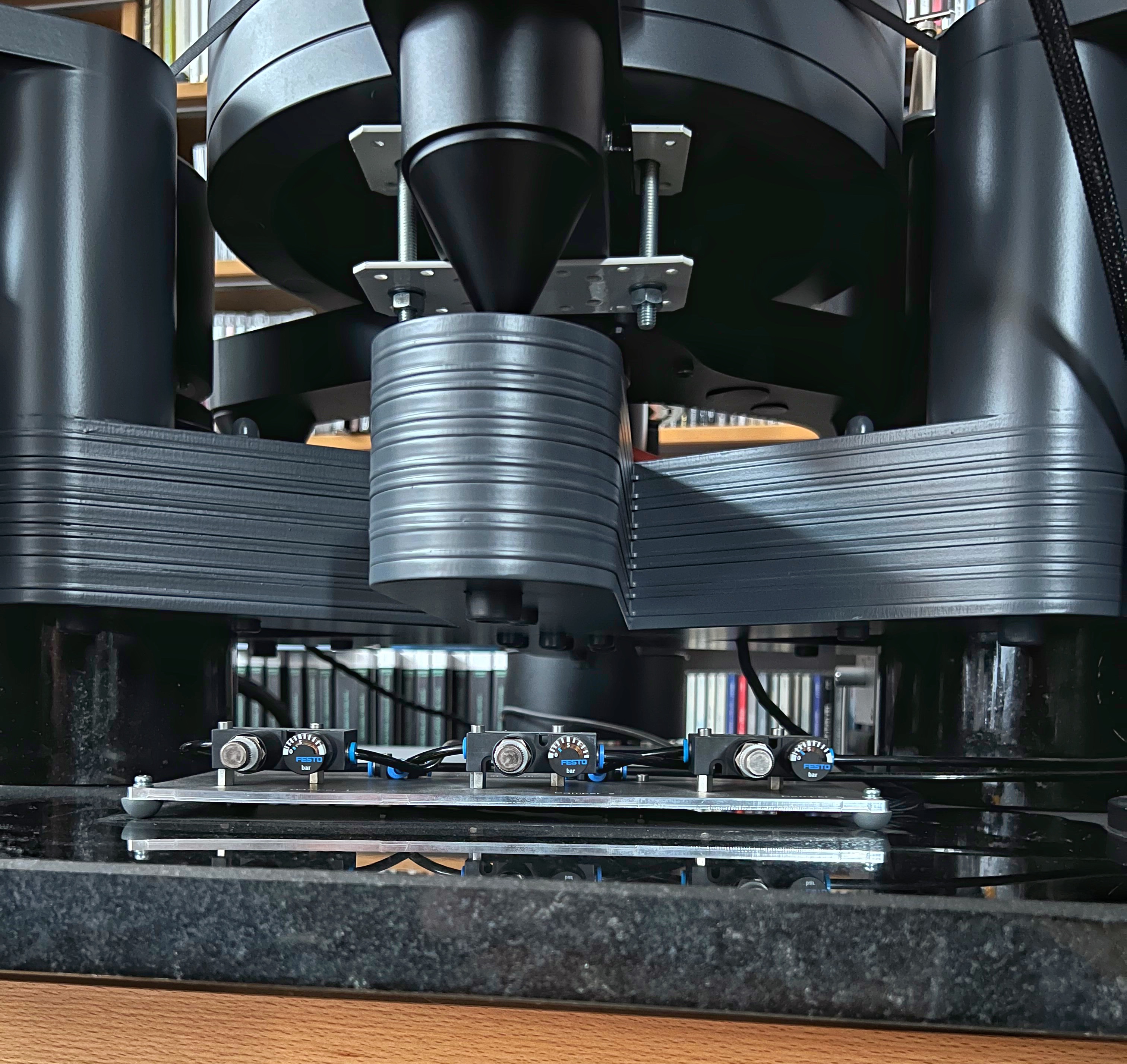 Low air pressure (Micro Seiki, TechDas) and high air pressure systems (Caeles II, Apolyth) are different. Only with high pressure you are able to decouple totally platter and the rest of the system. In this way we speak of a real Airbearing system. For most audiophiles the compressor in this way is too loud/expensive. Of course you need to use it in a different room!