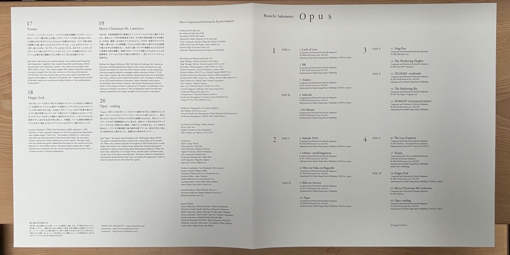 at New Years Eve I received the four 45 LPs from Ryuichi Sakamotos last work – Opus. It is the silence in between the fantastic piano accords which makes him a genius in composing and playing.