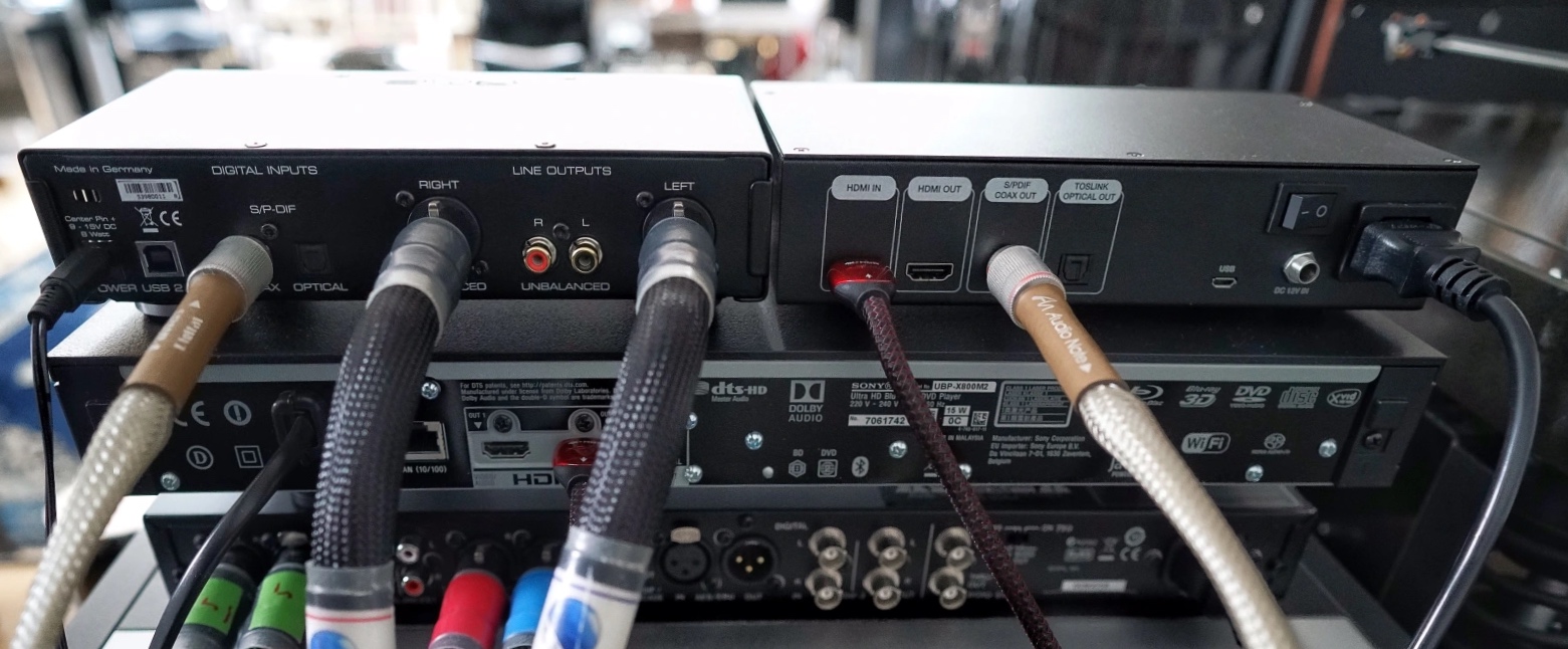 Using the HDMI input of the D.BOB unit (placed here on the left side) the data are put into DoP via HDMI Audioquest Cinnamon cable. The HDMI connection provides the full resolution (DSD64). In the next step a digital S/pdif output from the D.BOB to the ADI-2 DAC (unit shown on the right side – a studio machine) is used to bring the extracted data via an Audio Note Pallas cable to my Tascam recorder using the analog XLR outputs from the ADI-2.
