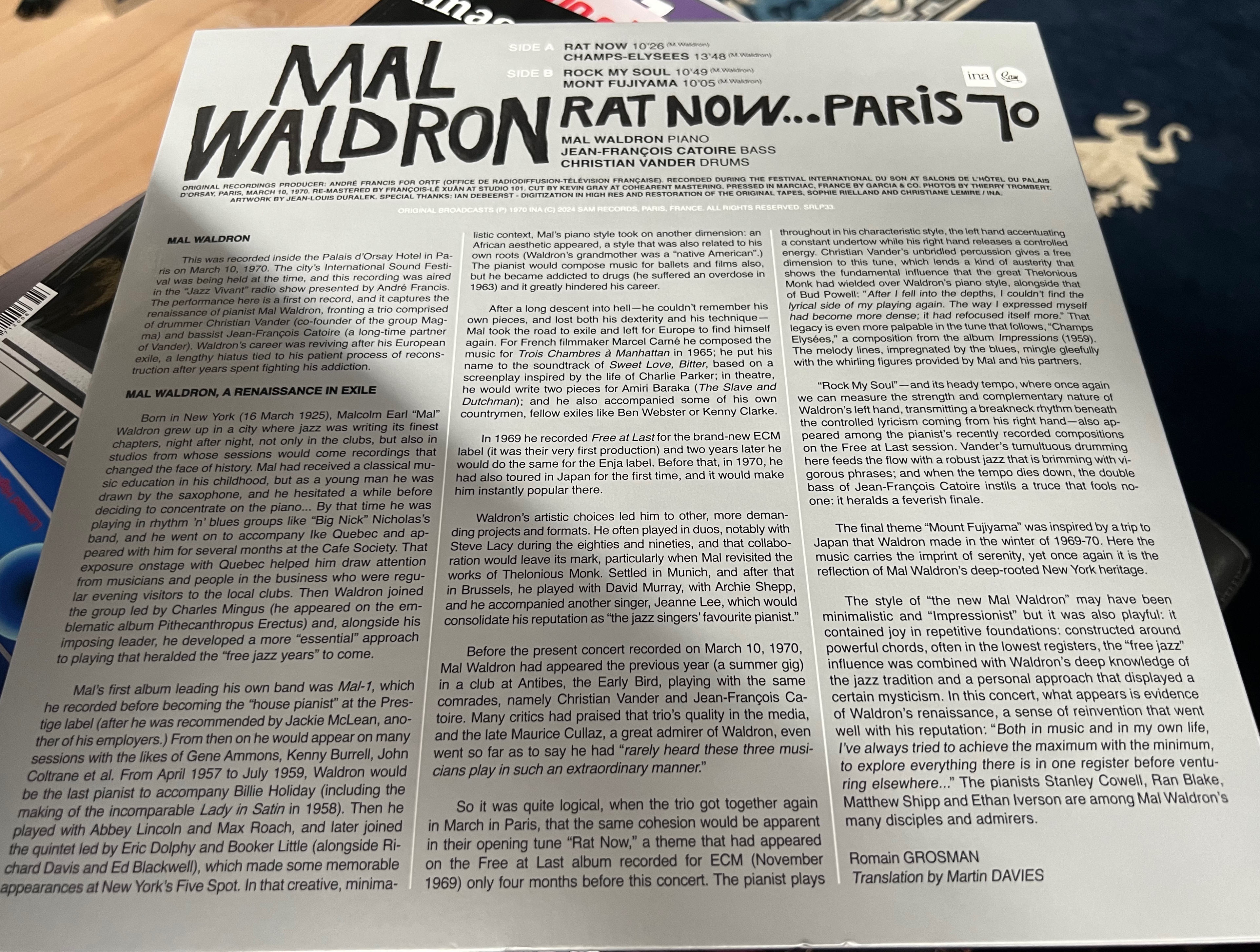 when I was vagabonding through record shops in Munich after High End 2025 with my friend from San Francisco I was pushed into the direction of Mal Waldron. Sorry to say but I never heard from him before. This changed when I bought the newly published vinyl of “Rat Now Paris 70” recorded in the Parisian hotel Palais d’Orsay in 1970.